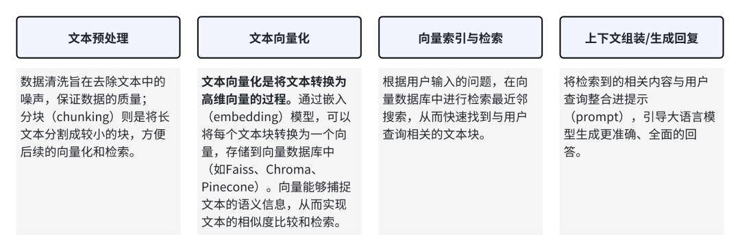 RAG的实现流程• 第一个大步骤就是将文本数据处理并进行向量化转化处理。这一步一般会用到 embedding 模型将文本块转化为向量并存储到向量数据库。