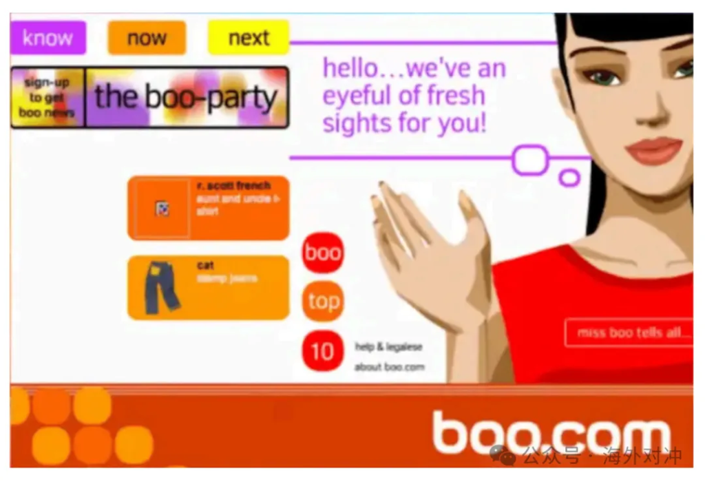这家公司在上线前就砸下2,500万美元做广告,员工从40人暴涨到400人,并在纽约和欧洲开设了豪华办公室。他们的网站大量使用 JavaScript 和Flash,在拨号上网环境下几乎无法使用,还与 Mac 电脑不兼容且漏洞百出。每四次尝试购买就有一次失败。尽管公司极尽铺张(奢华派对、搭协和飞机、为“Miss Boo”请名人造型师等),调查却显示只有13%的互联网用户知道这个品牌。不到18个月,资金耗尽。2000年5月,Boo.com宣告倒闭。