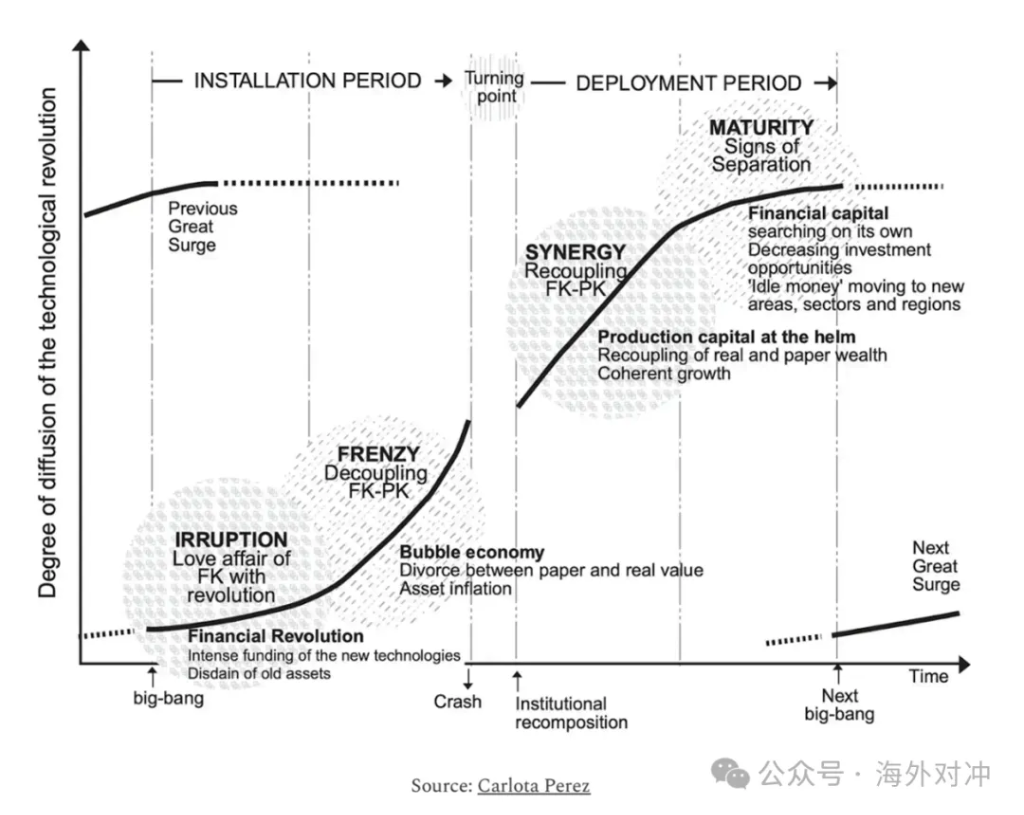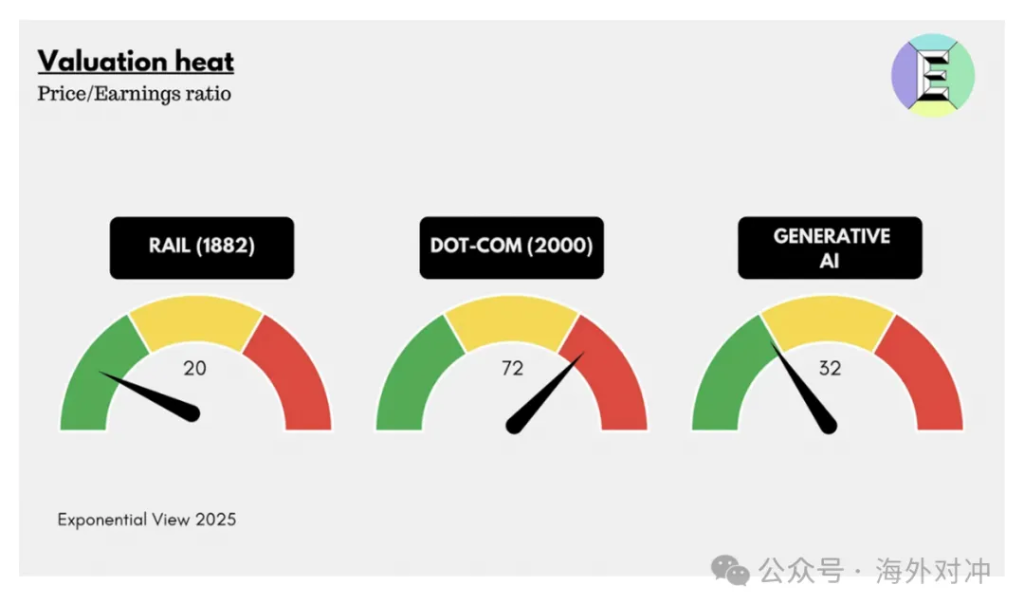 如果说经济压力和行业压力显示的是这场繁荣的“重量”,收入增长显示的是其“轨迹”,那么估值热度反映的就是市场情绪。这往往是泡沫最明显的表征:投资者对该领域的定价有多狂热,不管基本面如何。正如卡洛塔·佩雷斯几十年来反复强调的,每次技术革命的早期“安装阶段”,金融市场往往都会过度投入——投入的资本远远超出近期收入所能证明的合理水平。这种狂热在当时看似非理性,但正是社会铺设新基础设施的机制。问题在于,这股狂热能否顺利过渡到“部署阶段”,即基础设施变得无处不在、并带来真正的生产力提升。