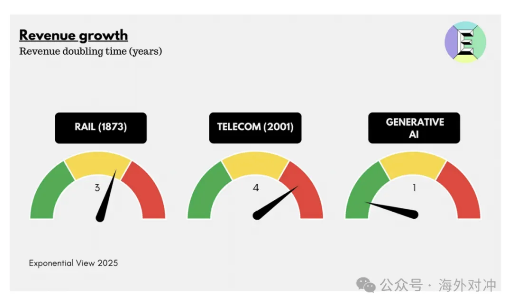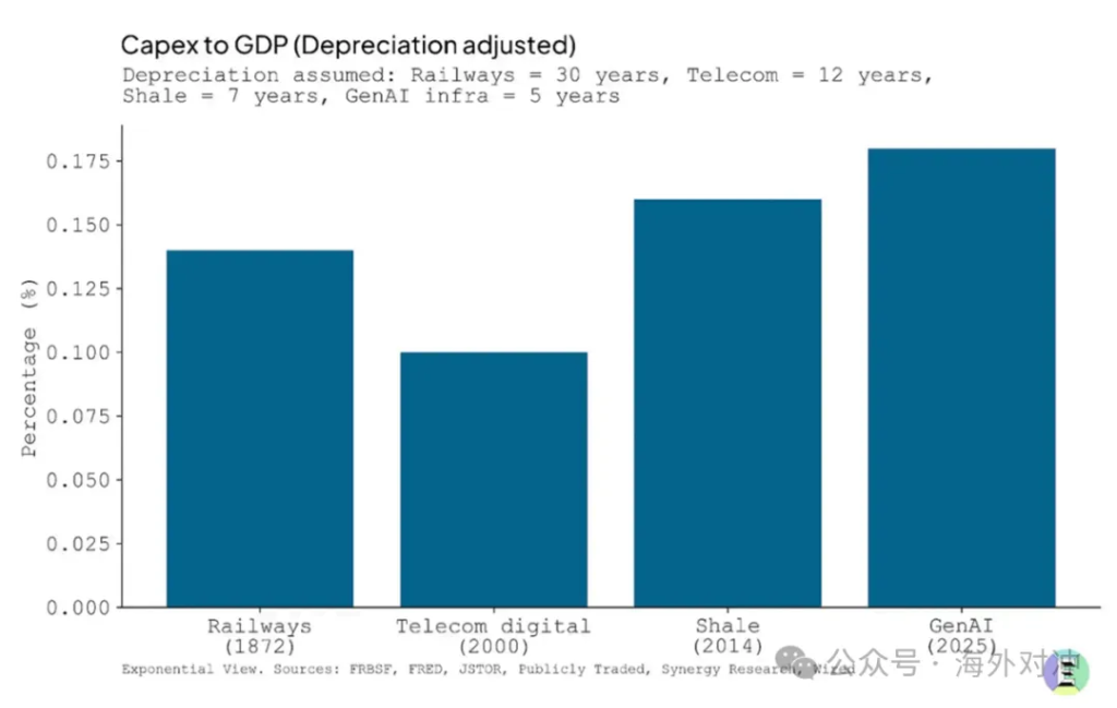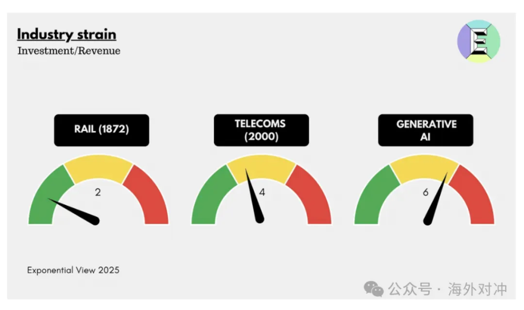 1872年美国铁路扩张达到高峰时,资本支出约为当年营收的两倍。1990年代末电信泡沫中,这个比率涨到了将近四倍。而相比之下,如今的 genAI 热潮是用约600亿美元的年收入来支撑全球约3,700亿美元的数据中心资本支出,比率高达6倍,是上述三者中压力最大的。