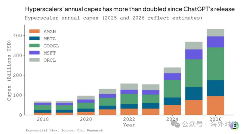 就AI 基础设施而言,其中大部分支出表现为资本支出:服务器、冷却系统、网络设备、钢筋水泥建造的机房,以及维持其运转所需的供电设施等。