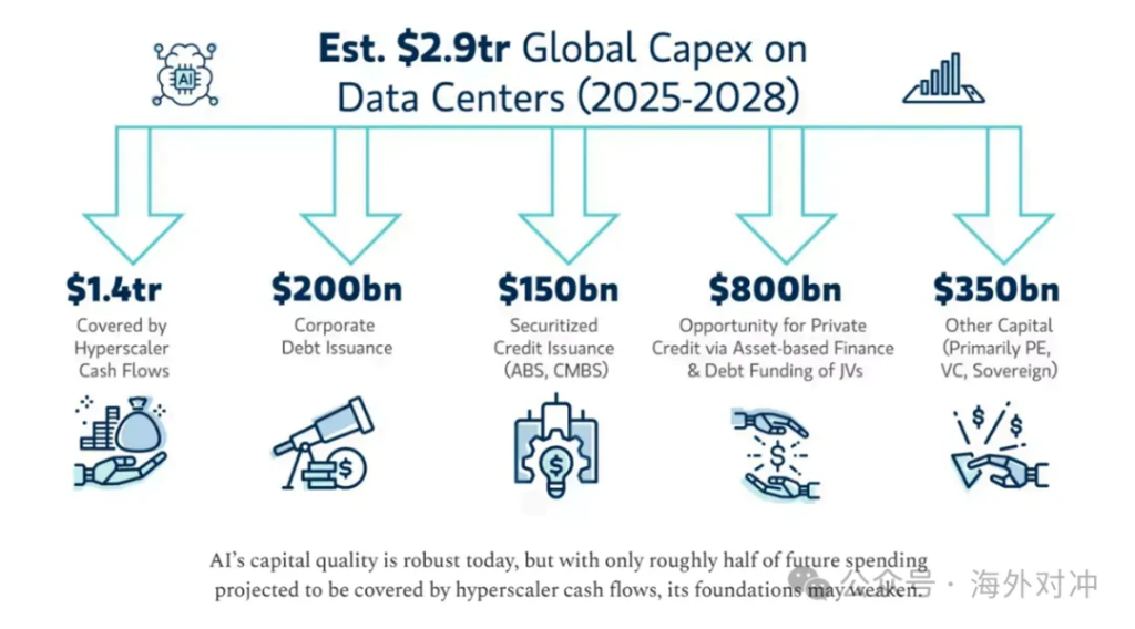 风险正在这里潜伏。摩根士丹利指出,大约有1.5万亿美元的资金缺口需要通过债券市场和资产支持证券来填补。这个数字相当惊人:私募信贷预计贡献8,000亿美元,数据中心资产证券化预计1,500亿美元,另外还有数千亿美元来自设备厂商贷款和供应商融资。光是那1,500亿美元,就几乎会让数据中心证券化市场的规模在一夜之间扩大两倍有余。而并非每个借款人都像微软那样稳健。