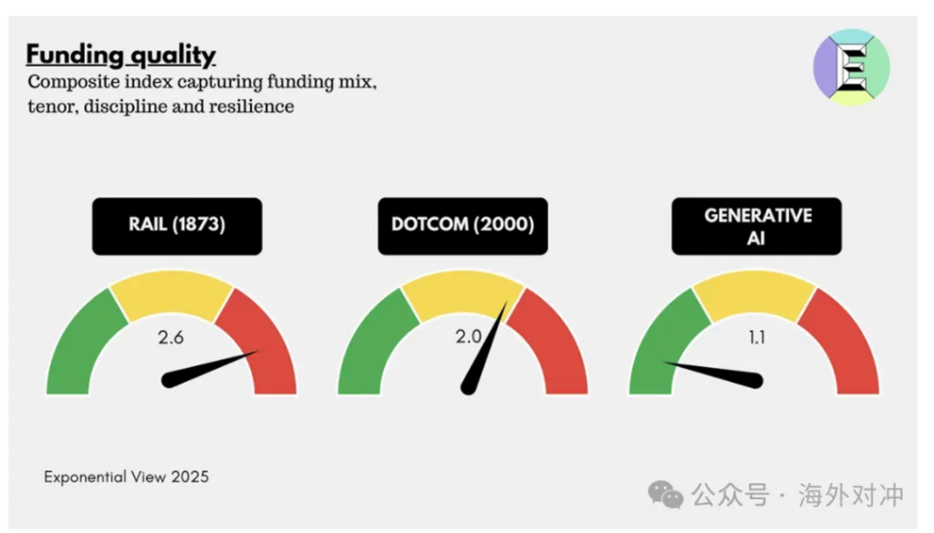在行业压力指标上,铁路时代的该比率一直保持在绿色的健康水平;而 genAI 已处于黄色区域,且逼近红线。